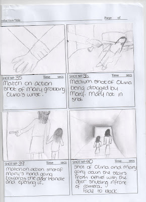 The music starts again and the shot zooms in very quickly into the girls’ eyelid. A flash back in black and white ‘old film’ effect begins of the 12 year old girl turning on the television and straight away a very violent and graphic film comes on, the little girl seems to be intrigued by this and wants to keep watching. During this sequence there will be over the shoulder shots of the girl watching the graphic film. There will also be close ups of the girls face to show her reaction to the violence as she has never seen this before. The last shot before the mother enters will be on the shoulder of the girl as she hears her mother enter, the girls head slowly turns towards her mother and slowly her mouth opens in a shocked way. However the audience still don’t see the mothers face. In this sequence the mother takes the little girl by the hand to the bottom of the cellar, just like in the first shot, except it is shot in a different angle than before. Except this time the camera follows the little girl and the mother to the cellar door, with the mothers’ face still unseen as she has turned around. This lets the audience understand that this was what the girl was punished for. After the girl has been taken to the cellar for the second time and the door has been slammed, the camera goes close to the door for a close up, then when the width of the door is in shot, the title of the film will appear in big bold white letters, the shot will then dramatically turn to a black screen as the music climaxes to a loud bang with the title still on the screen, then the title will fade.